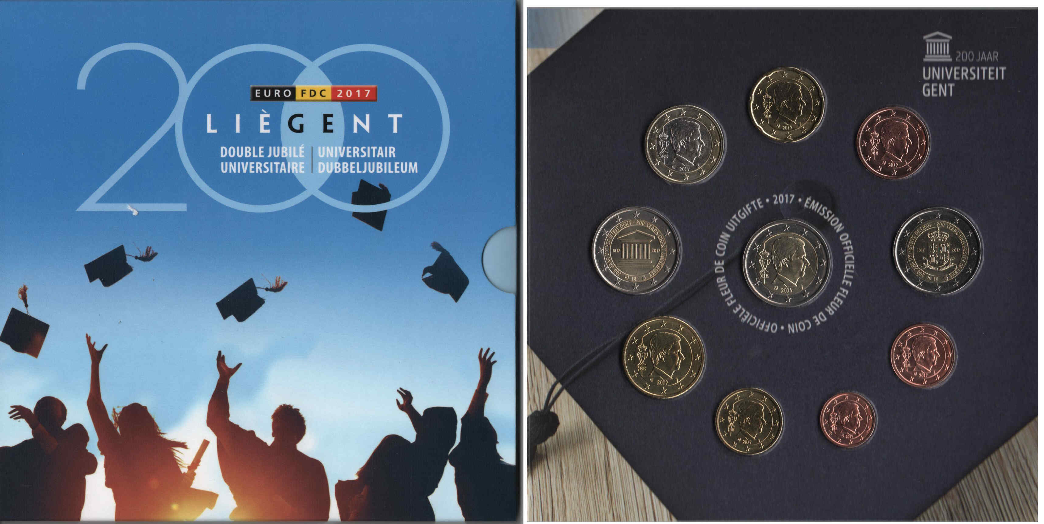 Auflage: 20.000 | enthält den kompletten Euro Münzen Satz 1 Cent - 2 Euro von Belgien 2017 und zusätzlich die 2 Euro Gedenkmünzen 200 Jahre Universität von Gent 2017 und 200 Jahre Universität von Lüttich 2017