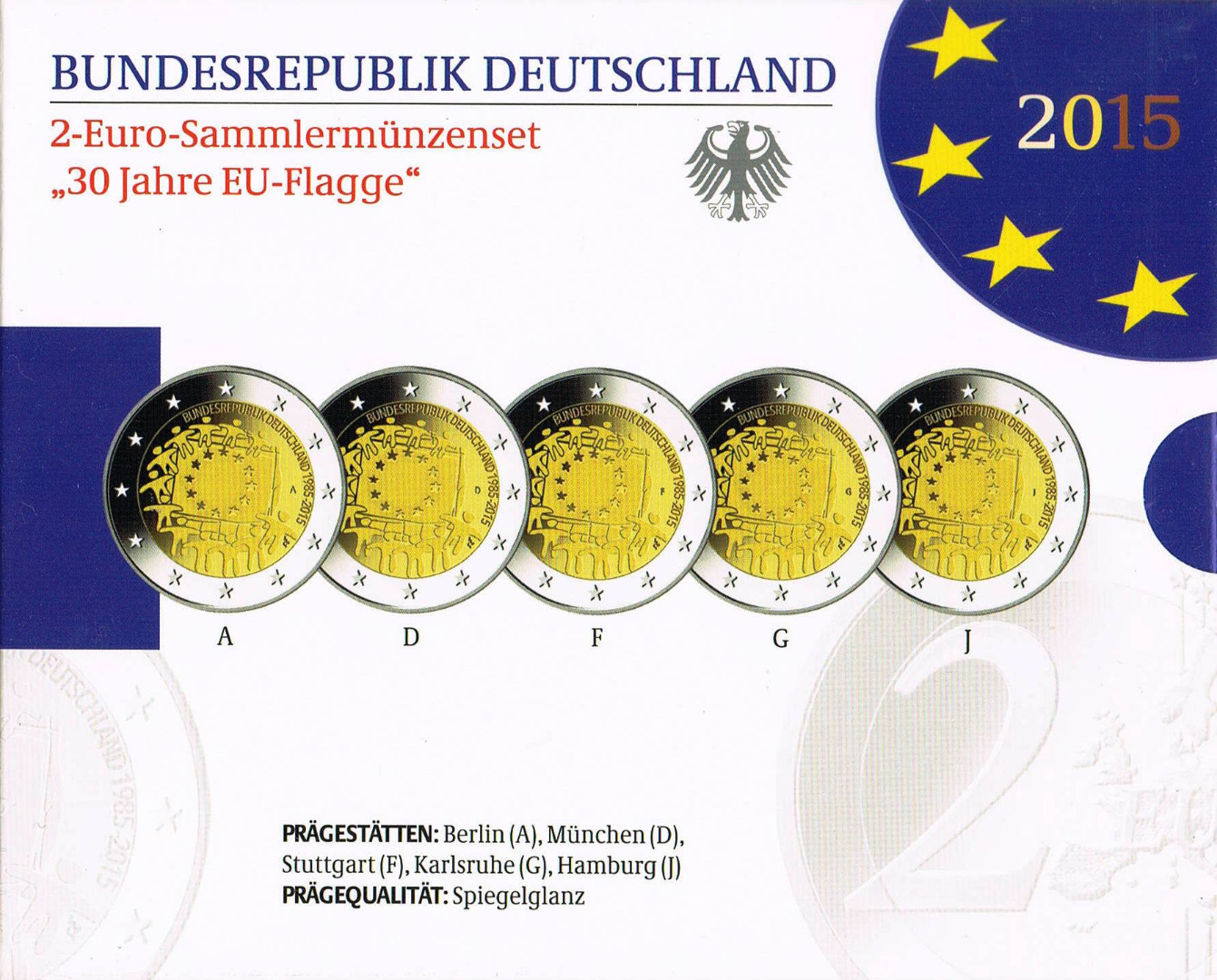 Auflage: 25.000 | enthält die 2 Euro Gedenkmünzen 30 Jahre Europa-Flagge 2015 mit allen 5 Prägebuchstaben A-D-F-G-J komplett Polierte Platte PP