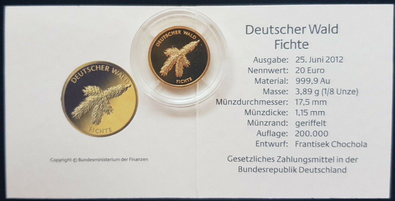 Deutschland 20 Euro Goldmünze Deutscher Wald - Motiv 3 - Fichte - J (Hamburg) 2012