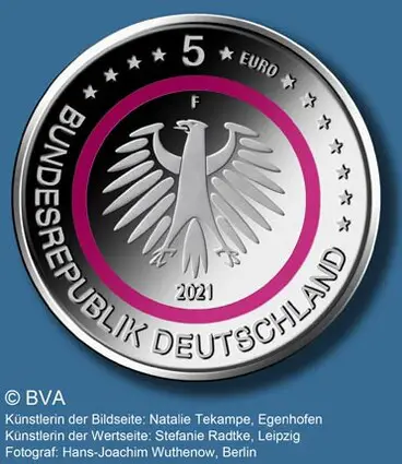 Auflage: 80.000 | Kupfer-Nickel | Gewicht: 9,00 g | Durchmesser: 27,25 mm | Violetter Polymerring (fünf verschiedene Violetttöne)