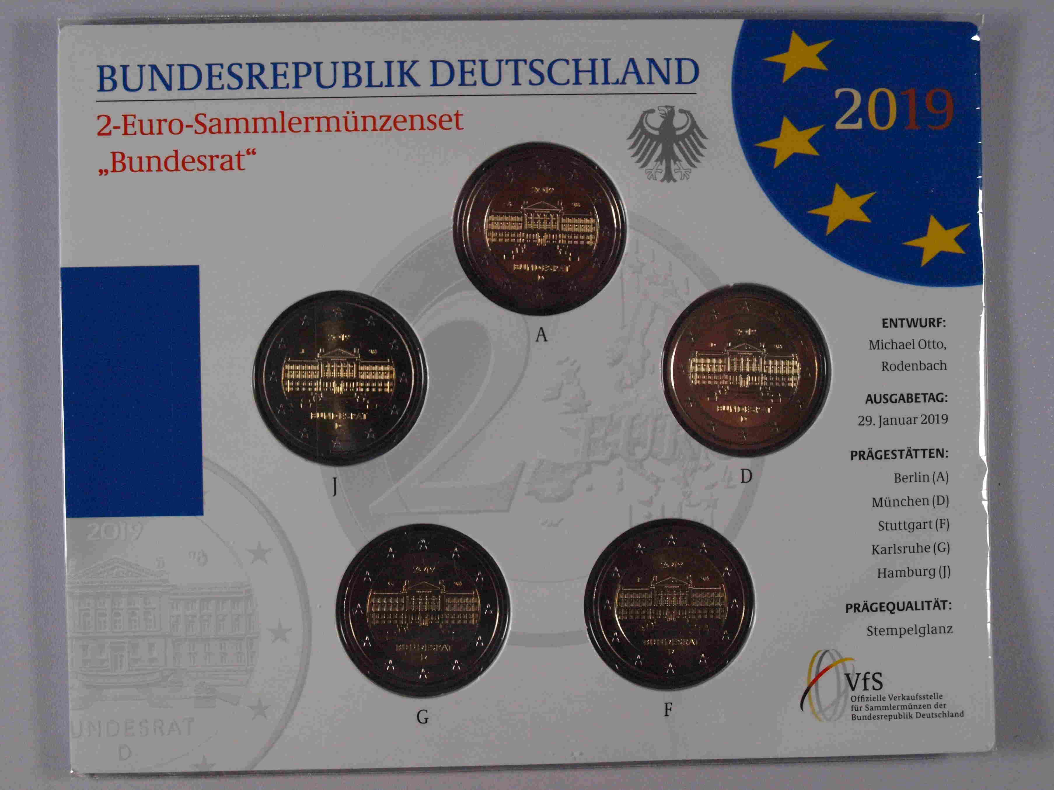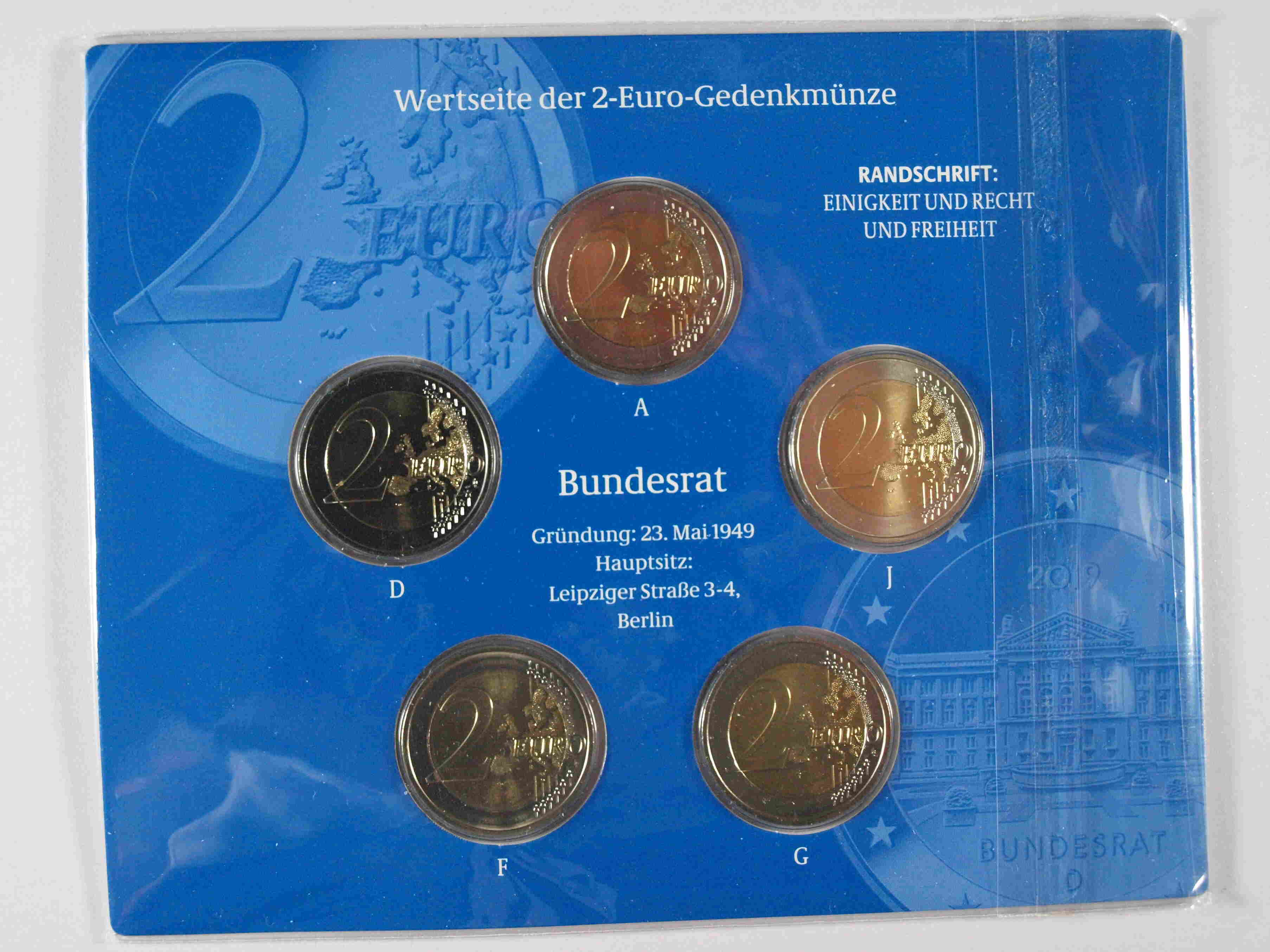 Auflage: 19.600 Serien mit allen 5 Prägebuchstaben | enthält zusätzlich die 2 Euro Gedenkmünze - 70 Jahre Bundesrat 2019