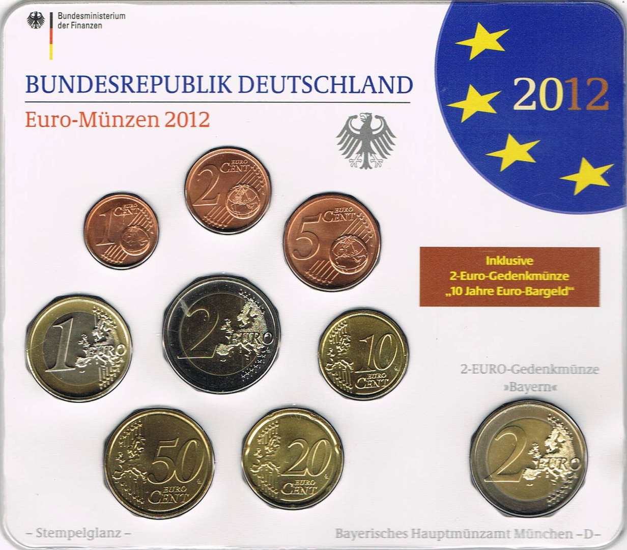 Auflage: 40.000 Stempelglanz | enthält den kompletten Euro Münzen Satz 1 Cent - 1 Euro und die 2 Euro Gedenkmünzen - Bayern - Schloss Neuschwanstein und 10 Jahre Euro-Bargeld der Prägestätte D - München 2012