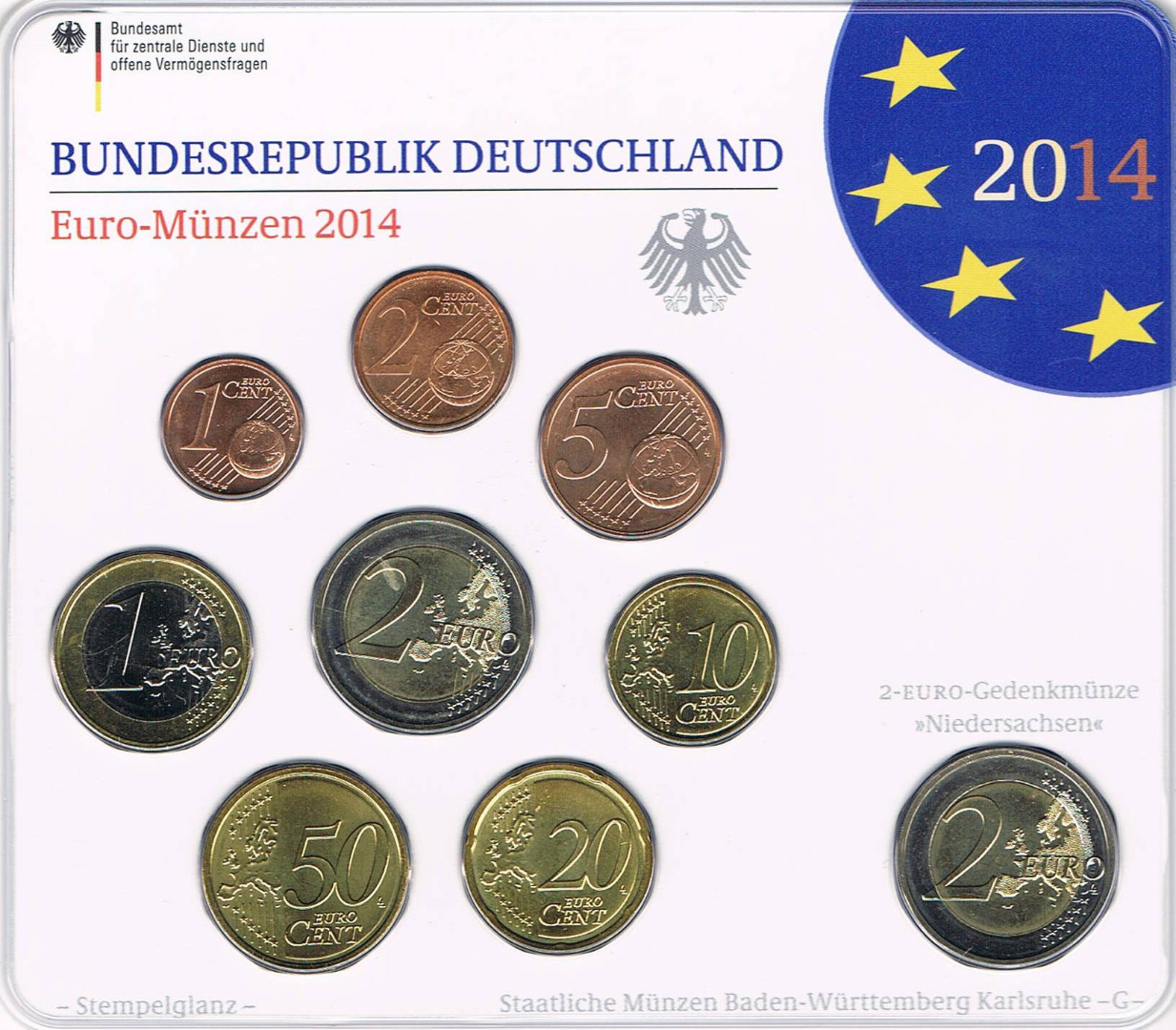 Auflage: 34.000 Stempelglanz | enthält den kompletten Euro Münzen Satz 1 Cent - 2 Euro und die 2 Euro Gedenkmünze - Niedersachsen - Michaeliskirche Hildesheim der Prägestätte G - Karlsruhe 2014