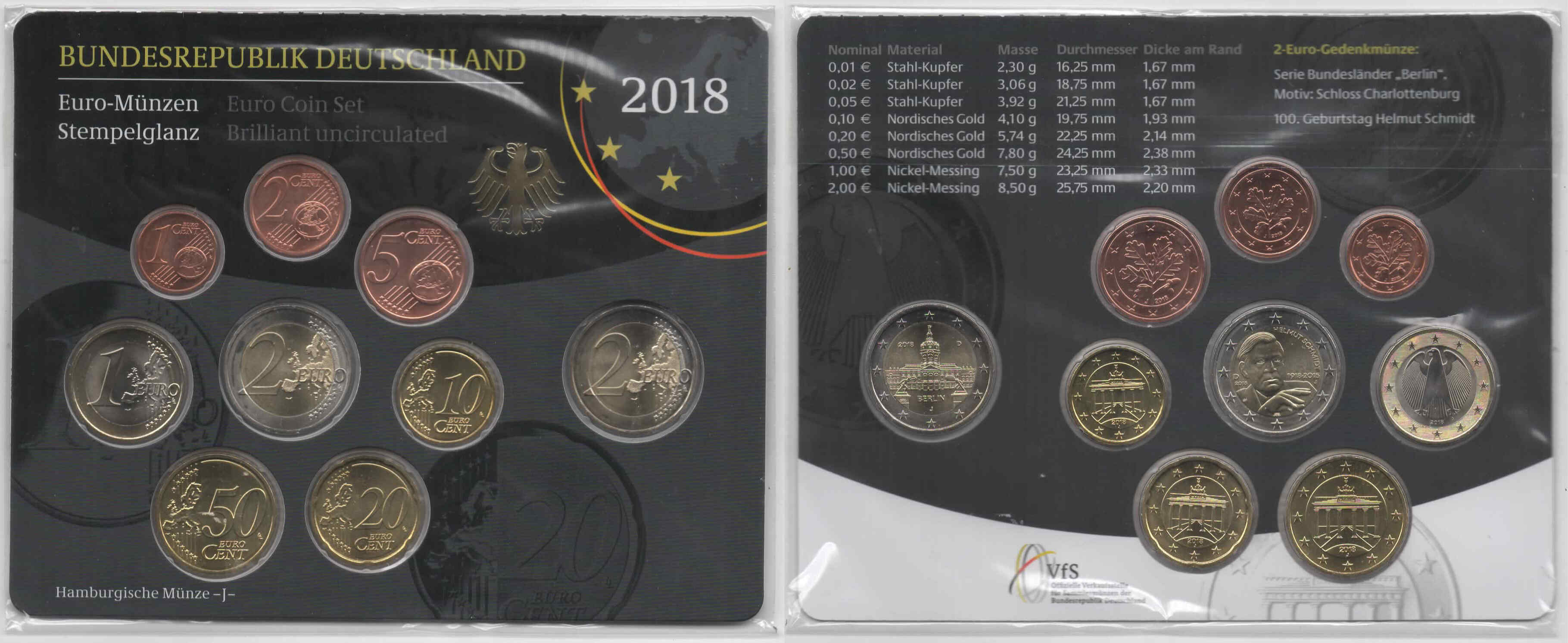 Auflage: 22.625 Stempelglanz | enthält den Euromünzen Satz 1 Cent - 1 Euro und die 2 Euro Gedenkmünzen - Bundesländer - Berlin - Schloss Charlottenburg und 100. Geburtstag von Helmut Schmidt der Prägestätte J - Hamburg 2018