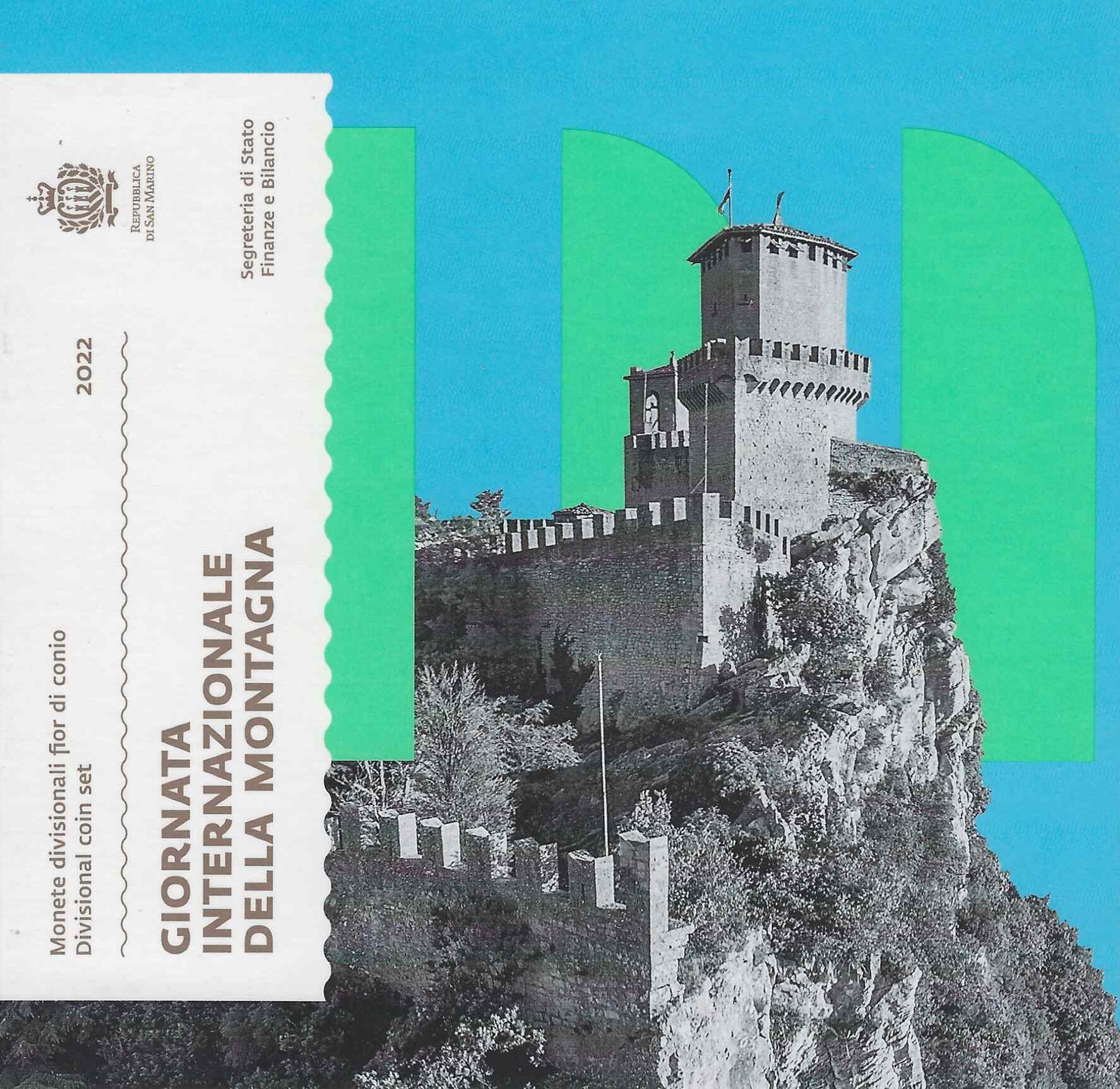 Auflage: 9.000 | enthält den kompletten Euromünzen Satz 1 Cent - 2 Euro von San Marino 2022 sowie die 5 Euro Silbermünze *Internationaler Tag der Berge 2022* (nur in diesem KMS) | Silber 925/1000 | Gewicht: 18,00 g | Durchmesser: 32,00 mm